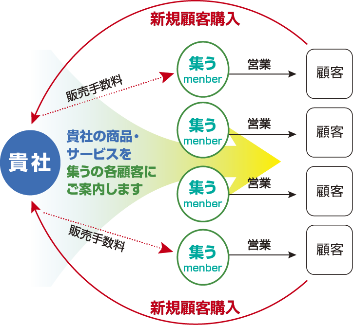「集う」では、あなたの商品やサービスを代わりに販売してくれる仲間が見つかります。互いに信頼し、協力することで、ビジネスの成長を加速させましょう。